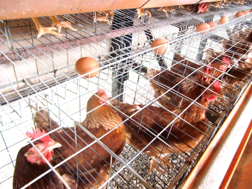 鶏たちをかごに入れて飼うケージ飼いの最大のメリットは、糞と鶏たちを分けられる点です。これにより、衛生的で病気へのリスクが低減できます。また、餌以外のものを食べない為、臭みの無い卵になります。通常2羽ずつ入れるかごに、当農場では半分の1羽ずつ入れて飼っており、ケンカなどのストレスが無く、食べたいだけの餌を十分に食べられる為、コク味の深い質の高い卵が産まれます。